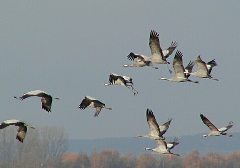 Kraniche bei Reichelsheim - unten in der Mitte mit hellbraunem Kopf ein Jungvogel