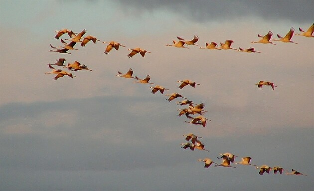 Alte und junge Kraniche im Abendlicht über der Horloffaue