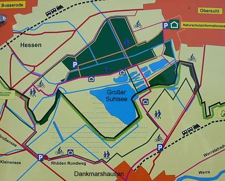 Unmittelbar an das NSG Rhäden von Obersuhl und Bosserode schließt sich südlich davon das im Jahr 1995 vom Freistaat Thüringen ausgewiesene NSG Dankmarshäuser Rhäden an, das ebenfalls aus Seggen-, Röhricht-, Schlamm- und Wasserflächen besteht. Hier wird das im Winter angestaute Wasser im Frühjahr abgelassen und die trockenfallenden Wiesen werden dann beweidet. In den Jahren 2000/2001 wurden im Gebiet zwei Beobachtungsstände mit Informationstafeln errichtet, die den Bereich 'Dankmarshäuser Rhäden' umfassend darstellen. Die Beobachtungsstände befinden sich südlich und östlich des Suhlsees auf der thüringischen Seite (siehe nachstehenden ausschnittsweise wiedergegebenen offiziellen Lageplan, der auch auf Schildern am Rundweg zu sehen ist).