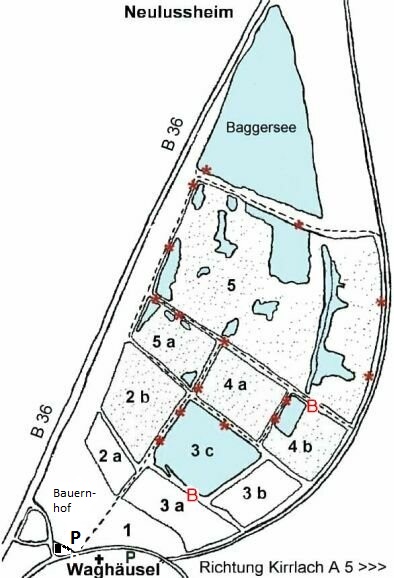 Im gesamten NSG kann man von Feldwegen aus beobachten. Einen Beobachtungsstand gibt es nicht. Der beste Ausgangspunkt zu dem Gebiet ist der Parkplatz an der Wallfahrtskirche in Waghäusel, zu dem man über die A 5 (Ausfahrt Kronau/Waghäusel) und Kirrlach gelangt. Vom Parkplatz muss man die Straße überqueren (am sichersten an der Kreuzung), um in das nördlich gelegene Gebiet zu gelangen - siehe Lageplan.